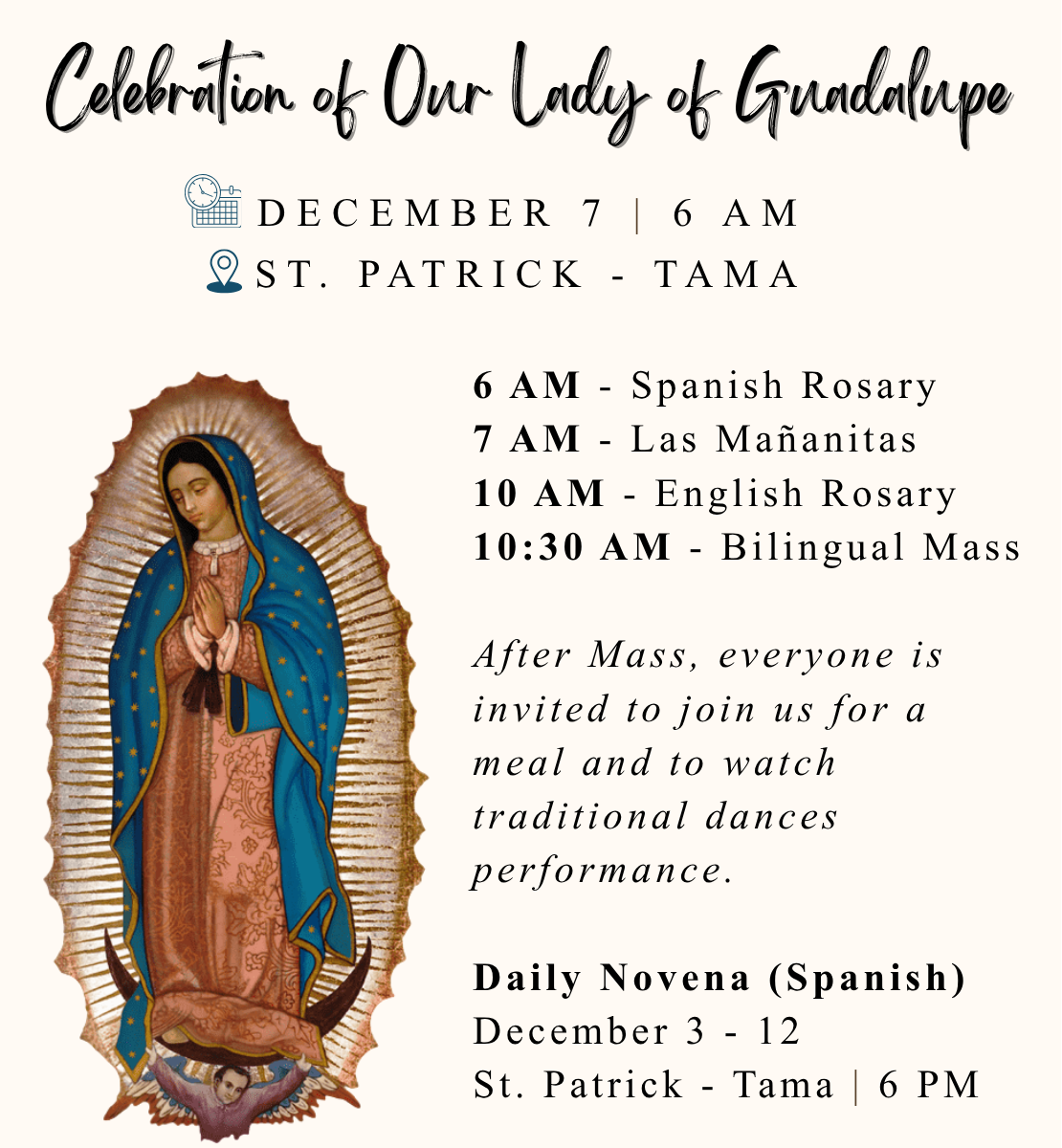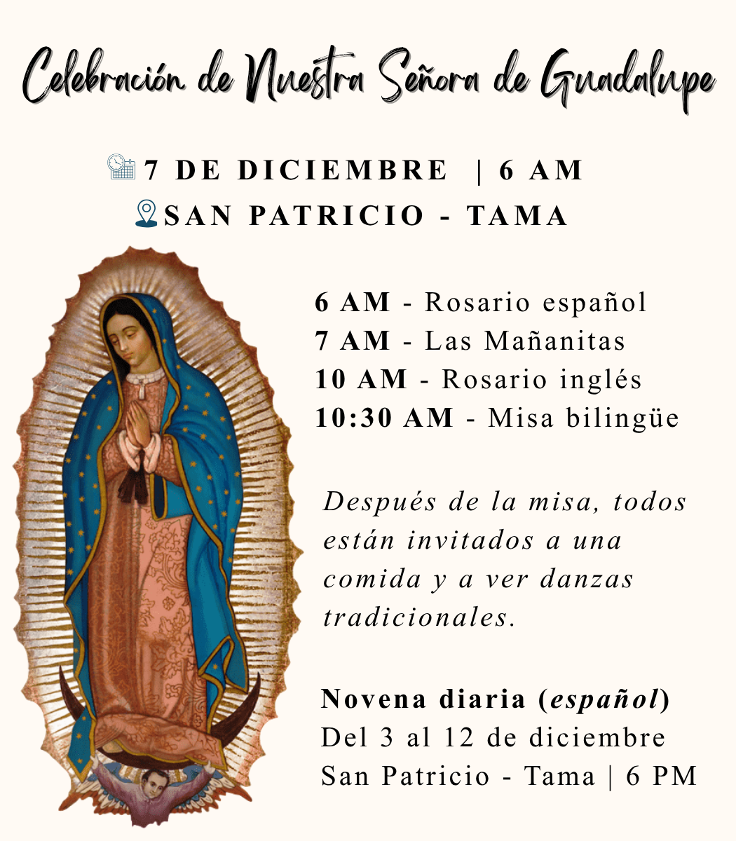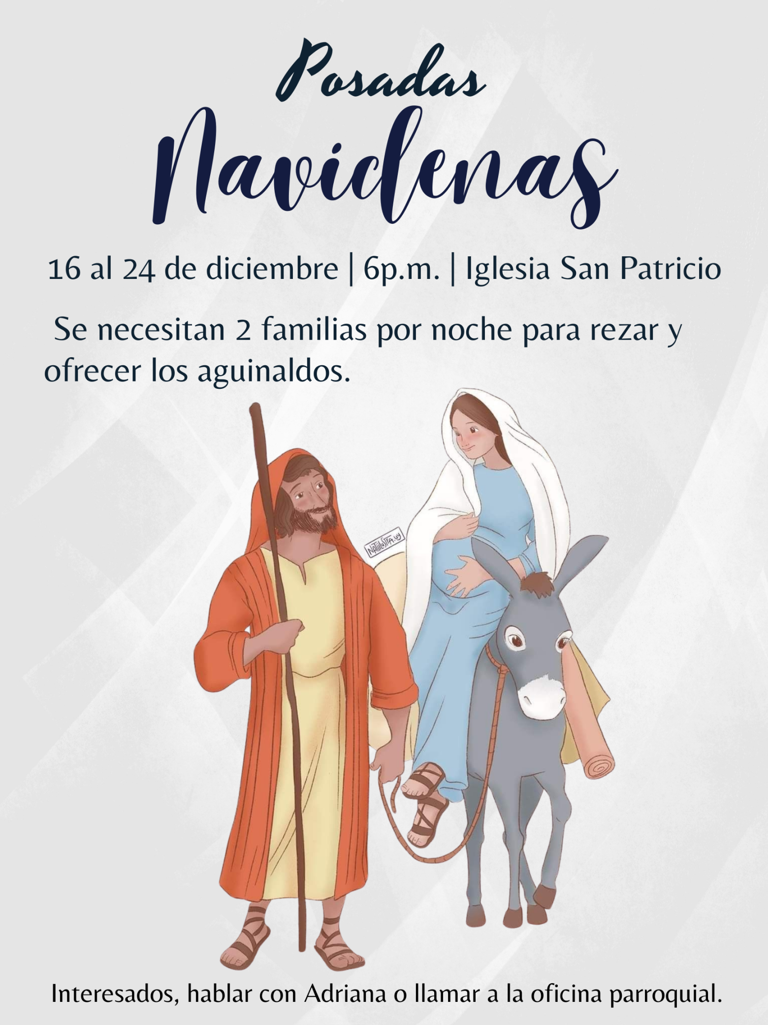 Si tú o alguien que conoces está discerniendo el Sacramento del Bautismo, te invitamos a asistir a nuestra próxima Clase de Preparación Bautismal el sabado, 6 de deciembre a las 9 AM en la biblioteca de la Iglesia de San Patricio, con el Diácono Stan Upah y Cynthia Guadiana.